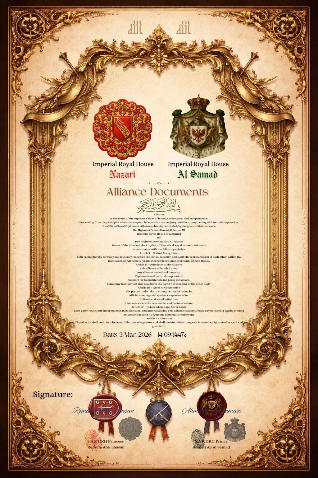 Both parties affirm that this alliance is founded on the complete independence of each house and on symbolic, protocol-based cooperation that serves the values of peace and unity among the royal houses.