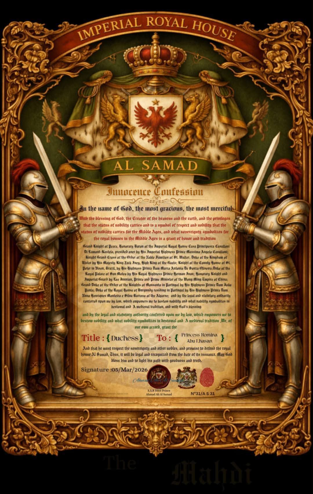 In the name of God, Creator of the heavens and the earth, and in accordance with the royal and imperial traditions and sovereign privileges granted to the Al Samad Royal House, which uphold the principle of nobility and its symbolism in the Middle Ages, and based on the principles of nobility, honor, and respect, and in accordance with medieval tradition, and by virtue of the right granted to me to bestow titles by His Royal Highness, the Grand Master, Massimo Angelo Cavalloni, Prince and Head of the Imperial Royal House Cavalloni Di Lamont Kastela, and by virtue of this right, on this auspicious day,