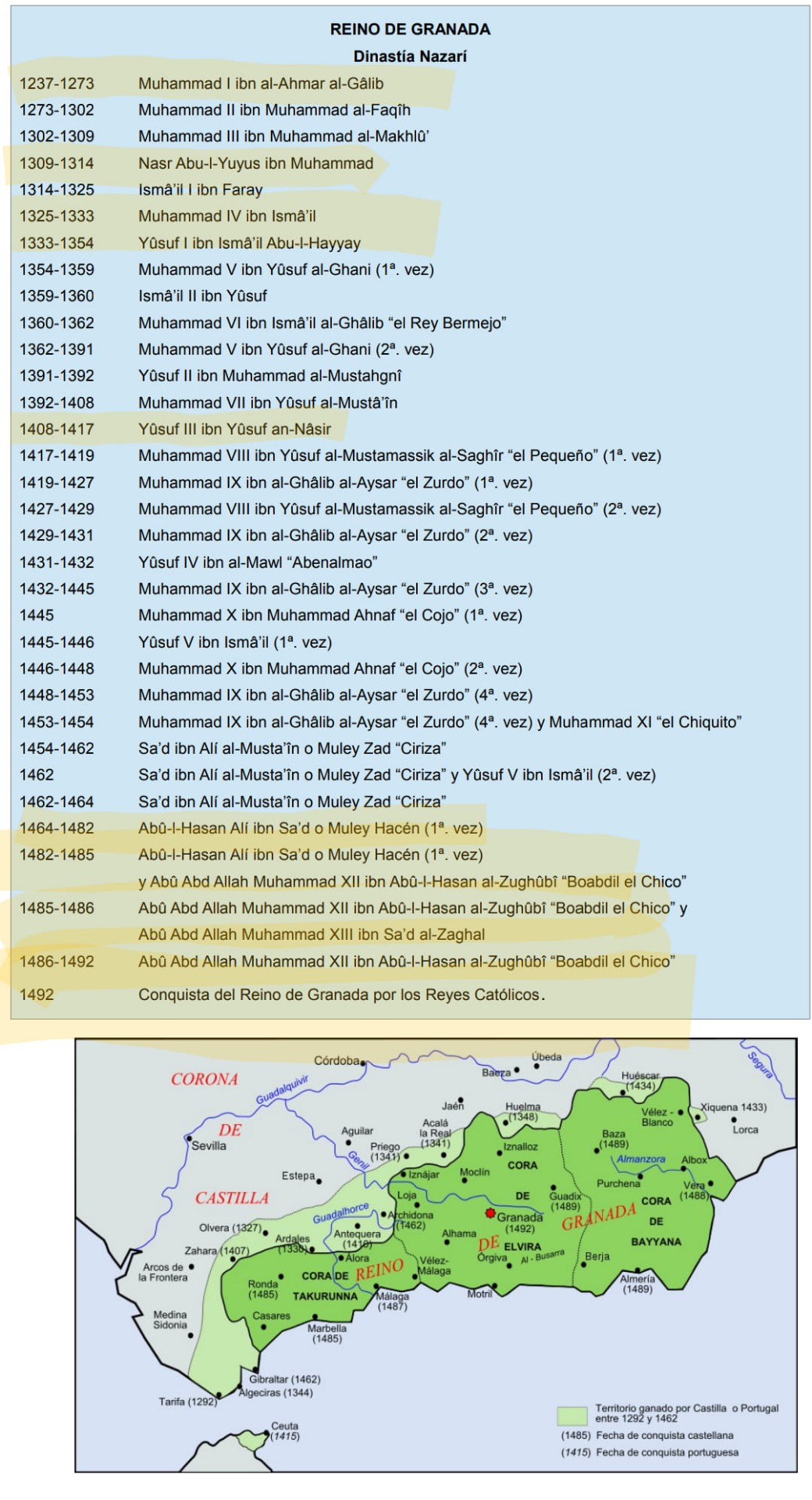 Sucesión historica de nuestro linaje Reino de Granada ,Casa Nazarí Los nombres con resaltador son parte de nuestra genealogía.الخلافة التاريخية لنسبنامملكة غرناطة ، منزل نصريالأسماء التي تحتوي على قلم تمييز هي جزء من علم الأنساب لدينا.